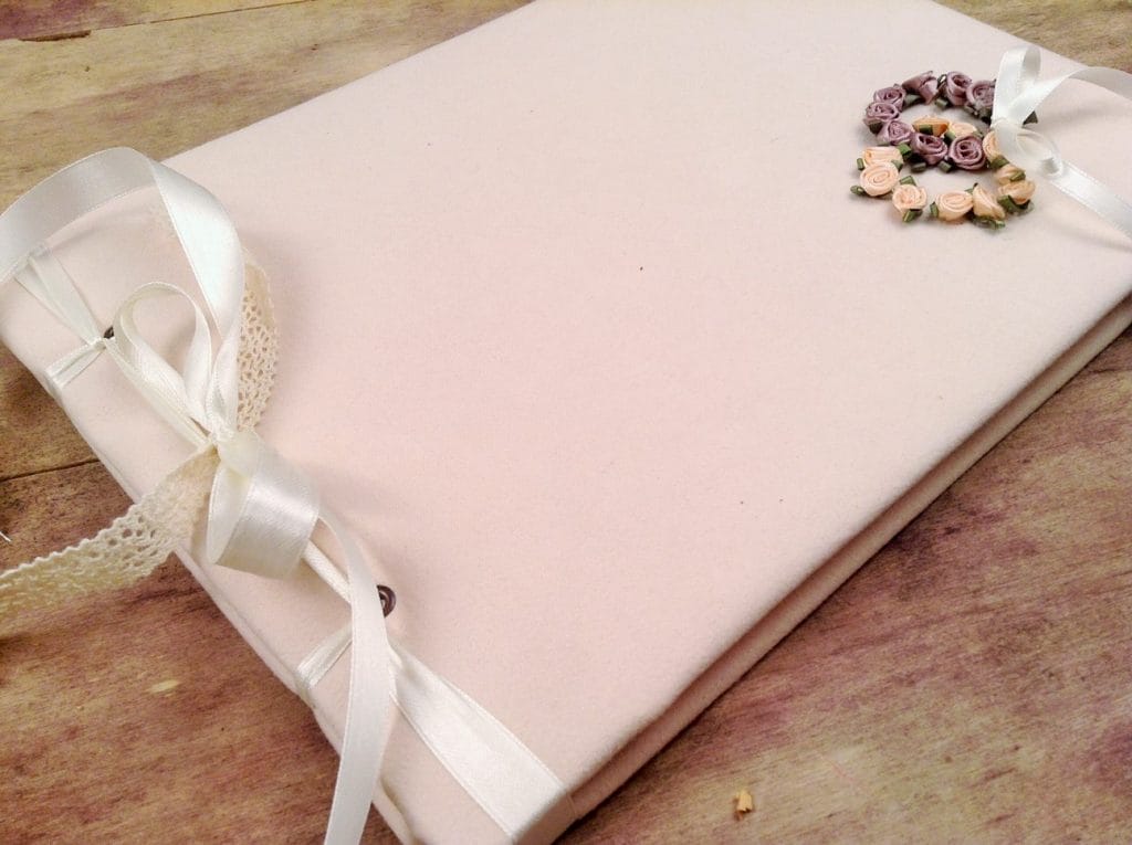 Το βιβλίο δένει με σατέν κορδέλες και δαντελίτσα.