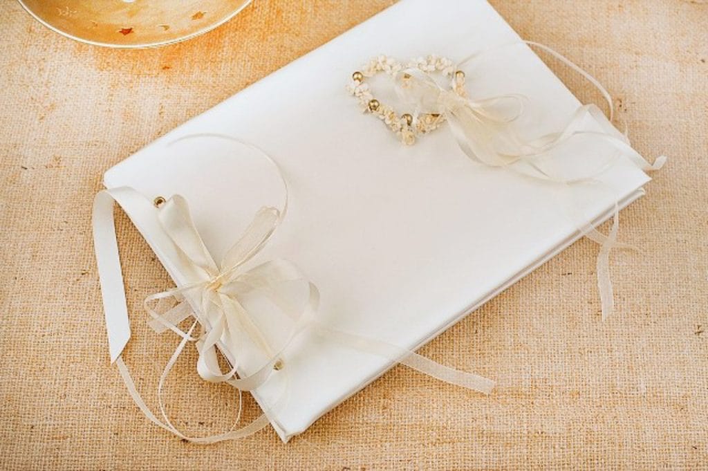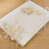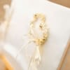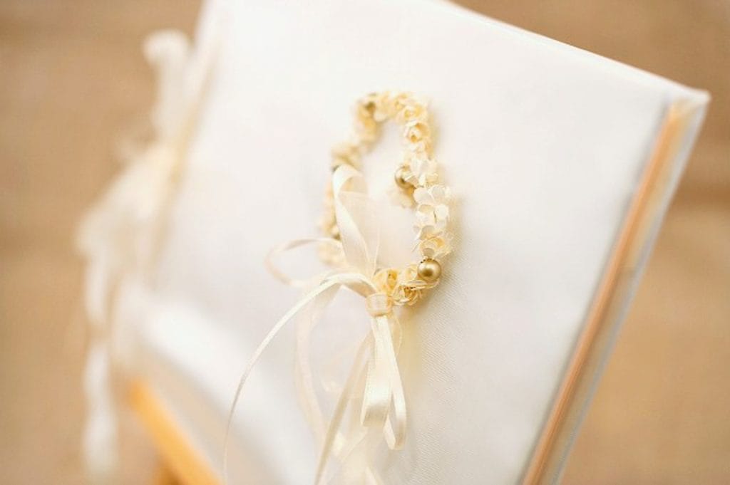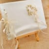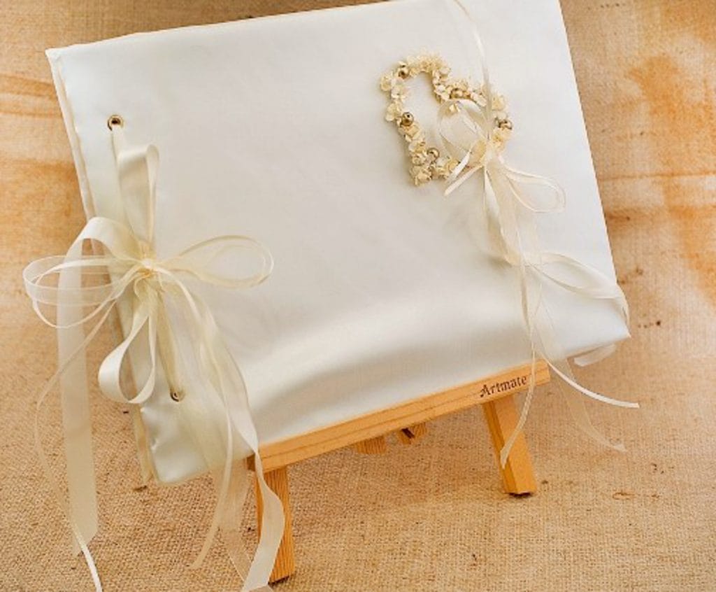 Δημιουργημένο με ιβουάρ σατέν ύφασμα και μία καρδιά στην άκρη τους από λουλούδια και χρυσές πέρλες.