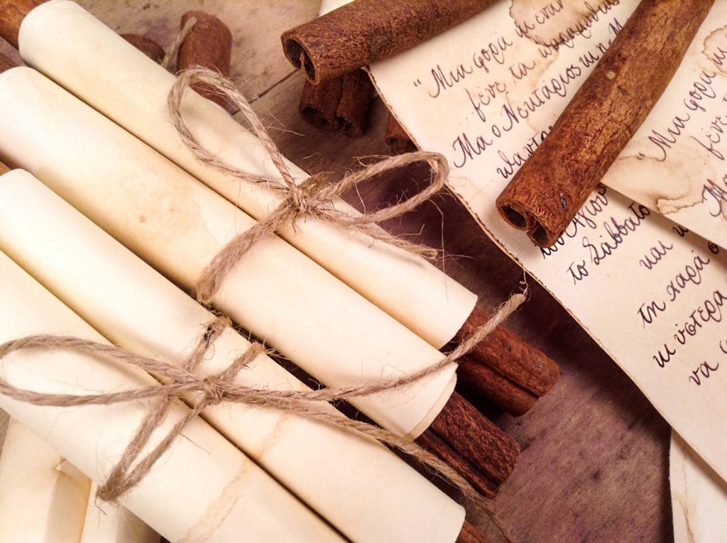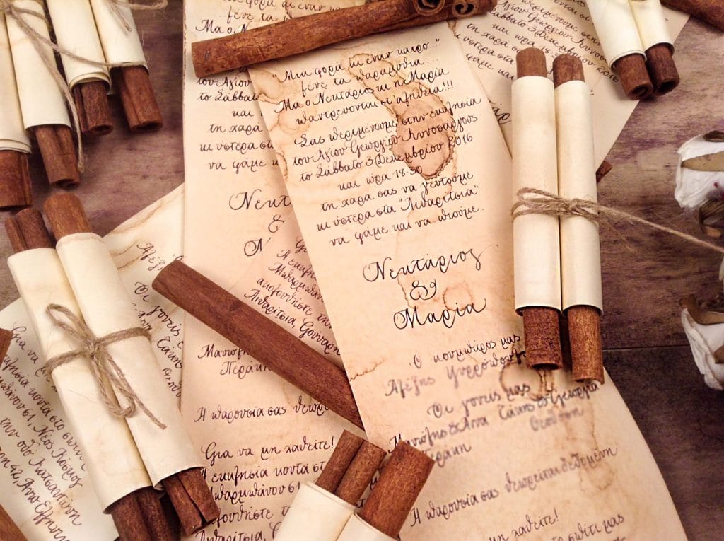 Φτιαγμένη από χαρτί που φαίνεται παλαιωμένο, τυλιγμένη σε ρολό και στις άκρες της υπάρχουν κανέλες. Δένει με σχοινάκι.