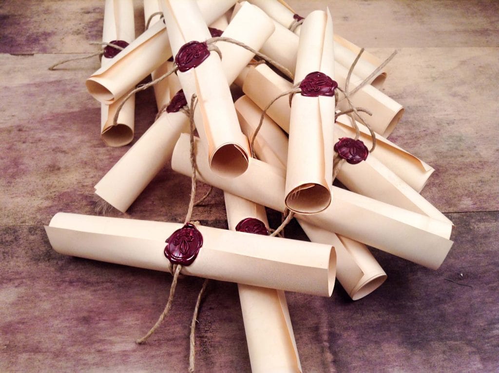 Φτιαγμένη με χαρτί που φαίνεται παλαιωμένο, γίνεται ρολό σαν πάπυρος και κλείνει εξωτερικά με σχοινάκια και βουλοκέρι.
