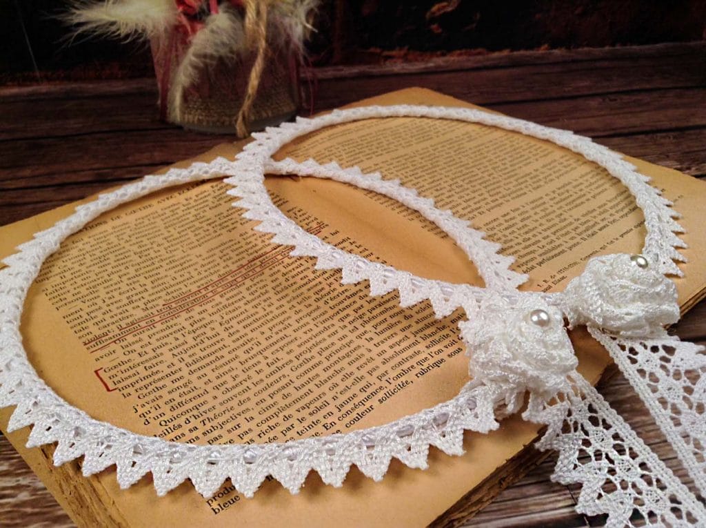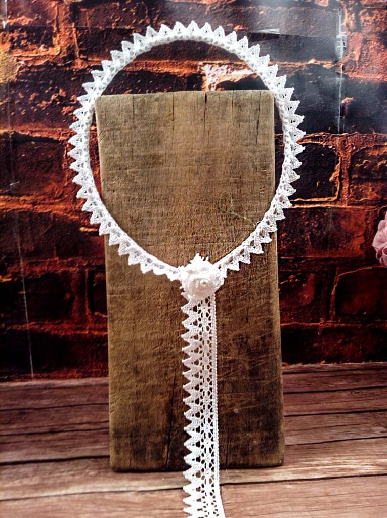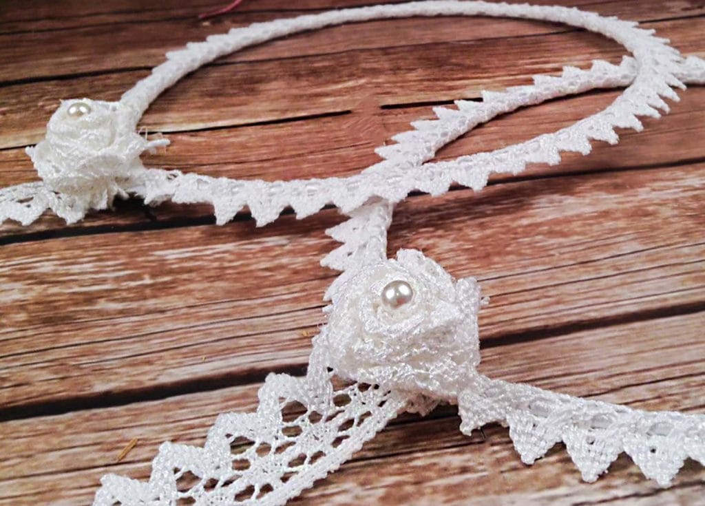 Φτιαγμένα από λευκή δαντέλα και δαντελένιο λουλουδάκι πίσω με περλίτσα στο κέντρο.