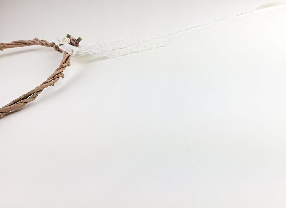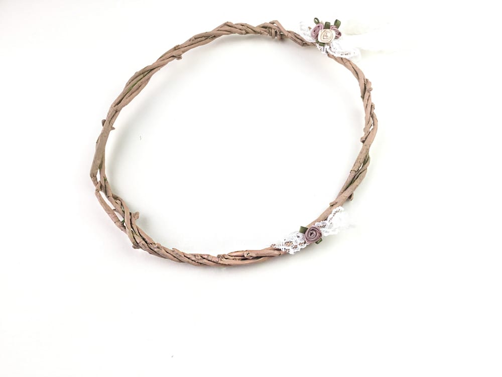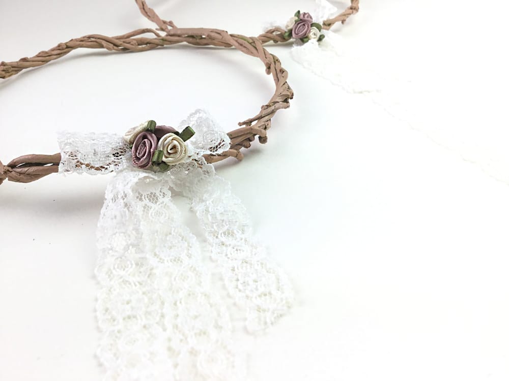 Στο πλάι σατέν λουλουδάκια και δαντελίτσα για τη νύφη, ενώ το στέφανο του γαμπρού είναι απλό χωρίς λουλουδάκια στο πλάι.