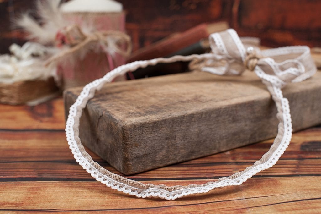 Πίσω η ίδια δαντέλα σχηματίζει φιόγκους που στο κέντρο τους υπάρχει μία όμορφη πέρλα.